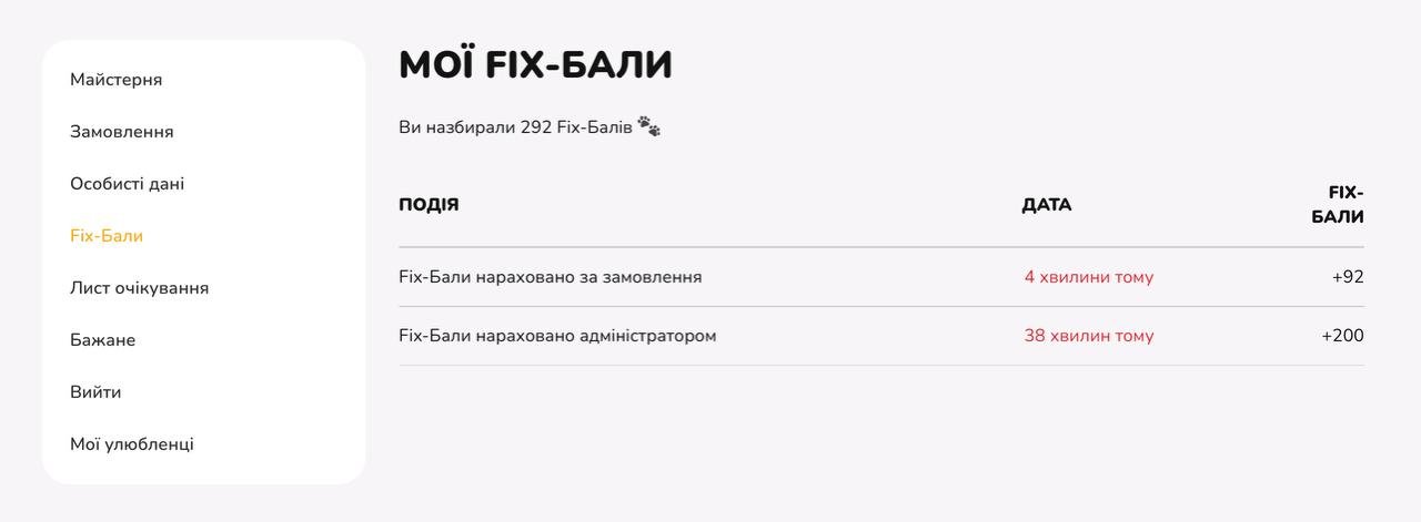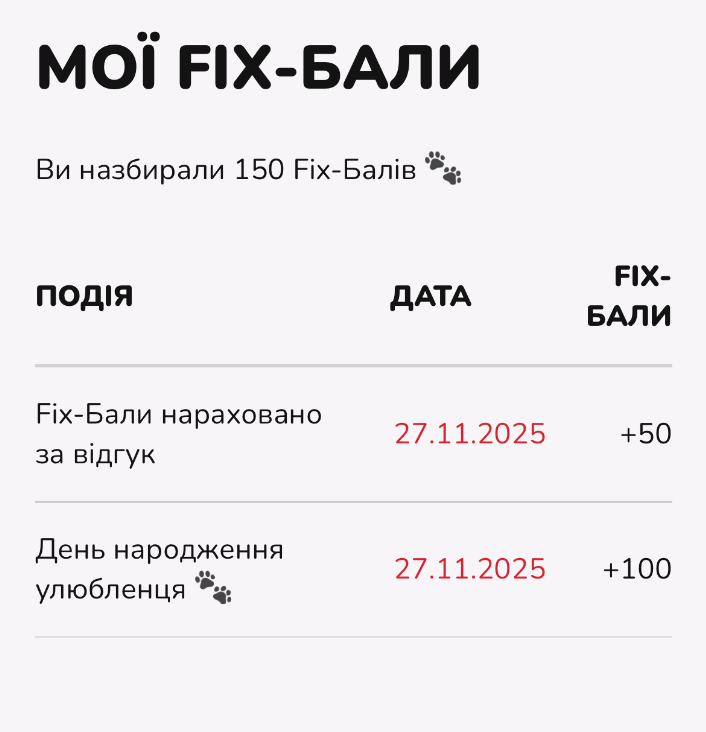 Бонусна програма Fix-Бали Ми цінуємо кожну покупку й дякуємо вам за довіру Кожен клієнт ZooFix бере участь у нашій бонусній програмі Fix-Бали -30% -10% -15% -20% Як це працює 1/1 За кожну покупку ви отримуєте 2 % від суми у вигляді Fix-Балів. 1 балл = 1 грн Накопичені Fix-Бали можна використати при наступних замовленнях 15% Максимум - до 15 % від вартості замовлення можна оплатити бонусами. Приємні сюрпризи 100 Fix-Балів Даруємо 100 Fix-Балів до дня народження вашого улюбленця – просто вкажіть дату народження у профілі. 3 % знижка 3 % знижка на перше замовлення – як подяка за знайомство з нашим магазином. Як перевірити свої Fix-Бали У особистому кабінеті ви зможете побачити: історію нарахувань скільки балів накопичено бали, які вже використані Умови використання Fix-Бали не обмінюються на гроші. Термін дії - 6 місяців з моменту нарахування. Якщо товар повертається, нараховані бали анулюються. Ми залишаємо за собою право змінювати умови програми, щоб робити її ще вигіднішою Любов із першої покупки Купуйте, накопичуйте Fix-Бали, тіште своїх улюбленців і повертайтеся за новими радощами. Перейти до Каталогу