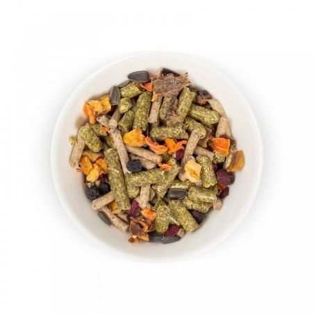 Склад: трав’яний гранулят, комбікорм для шиншил, насіння соняшнику, сушена морква, сушений буряк, сушені яблука. шипшина, горобина, глід, кероб подрібнений.