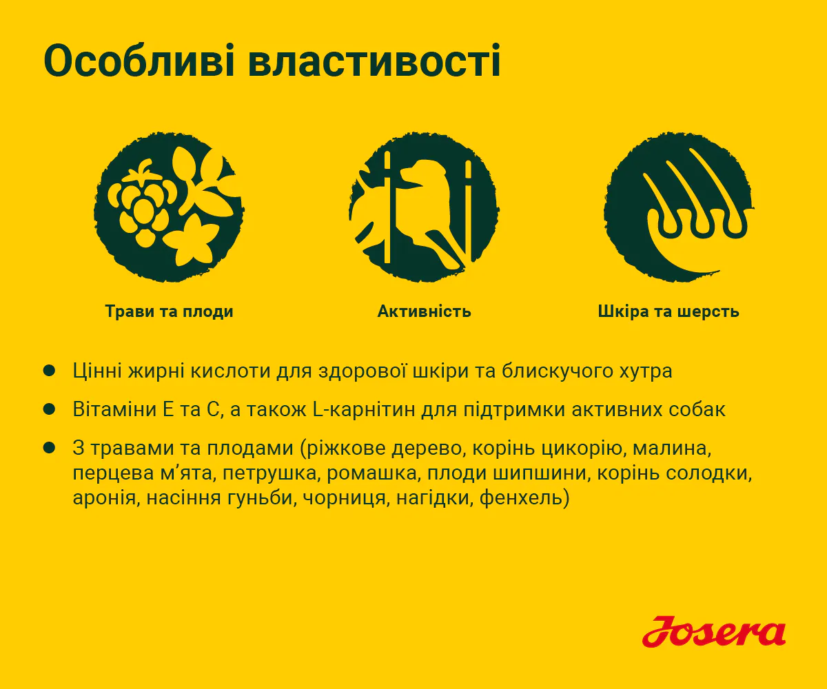 JOSERA Active Nature високоцінний корм з добре збалансованою рецептурою з найкращих натуральних складових, який забезпечує необхідною енергією наших волелюбних «клубків енергії». З додатковою порцією м’яса смачної домашньої птиці та ніжного ягняти.