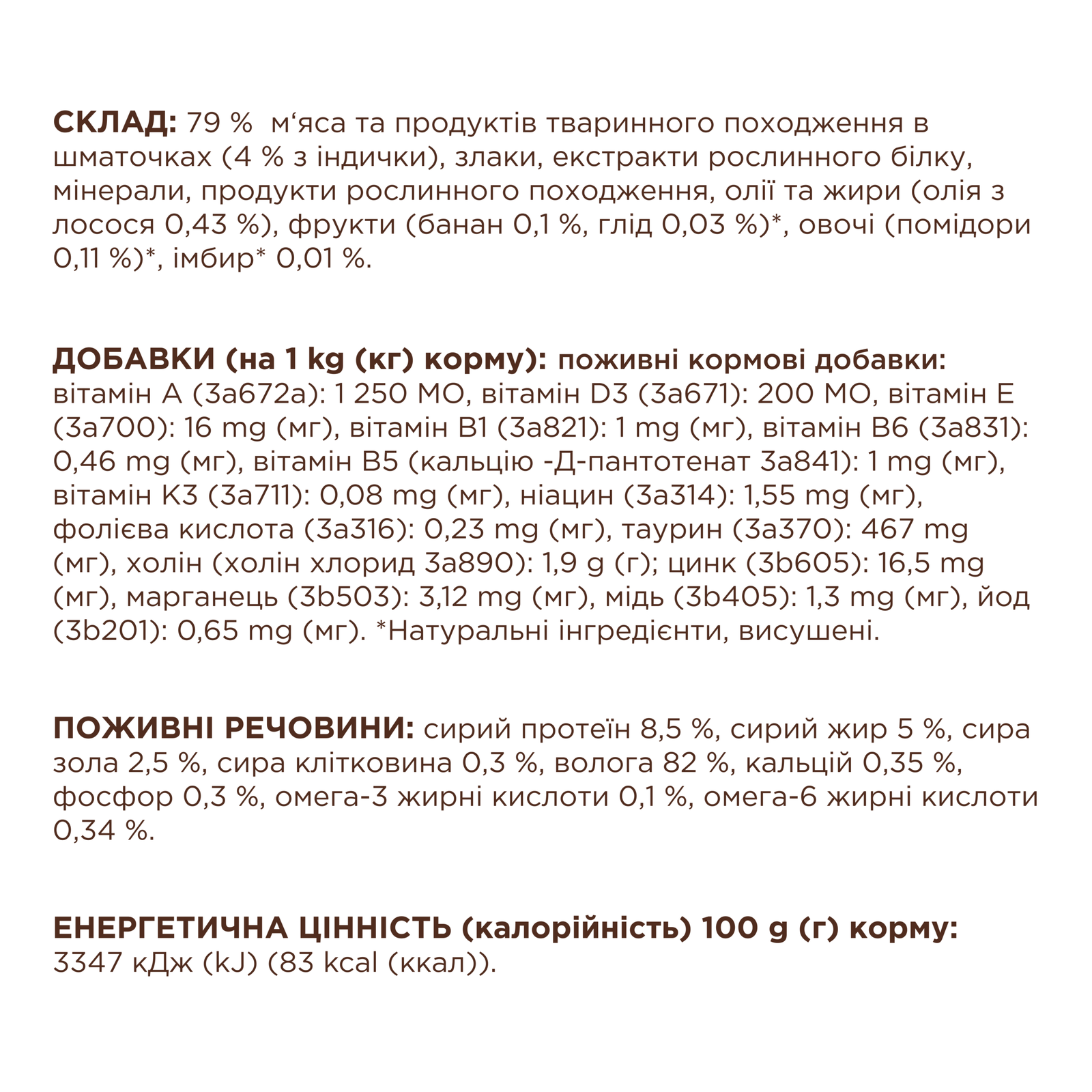 Індичка є джерелом легко засвоюваного тваринного білка, який допомагає підтримувати м’язову масу та оптимальний рівень енергії. Збалансований склад сприяє здоровому травленню, гарному самопочуттю та блискучій шерсті кота.