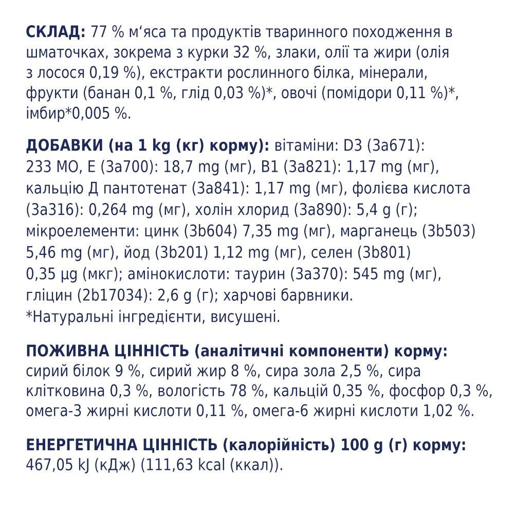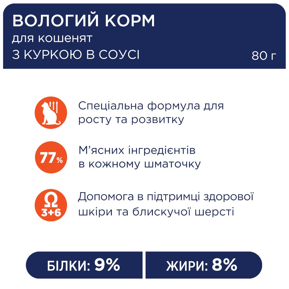 Повнораціонний вологий корм преміумкласу C4Р Premium із ніжними шматочками курки в ароматному соусі спеціально розроблений для кошенят у період активного росту та розвитку. М’яка текстура та насичений смак сприяють гарному апетиту й легкому переходу на самостійне харчування.