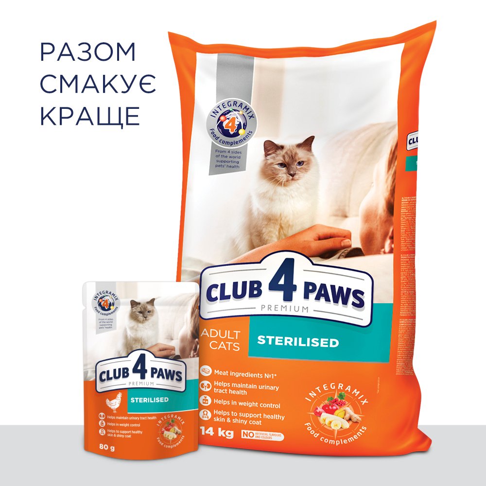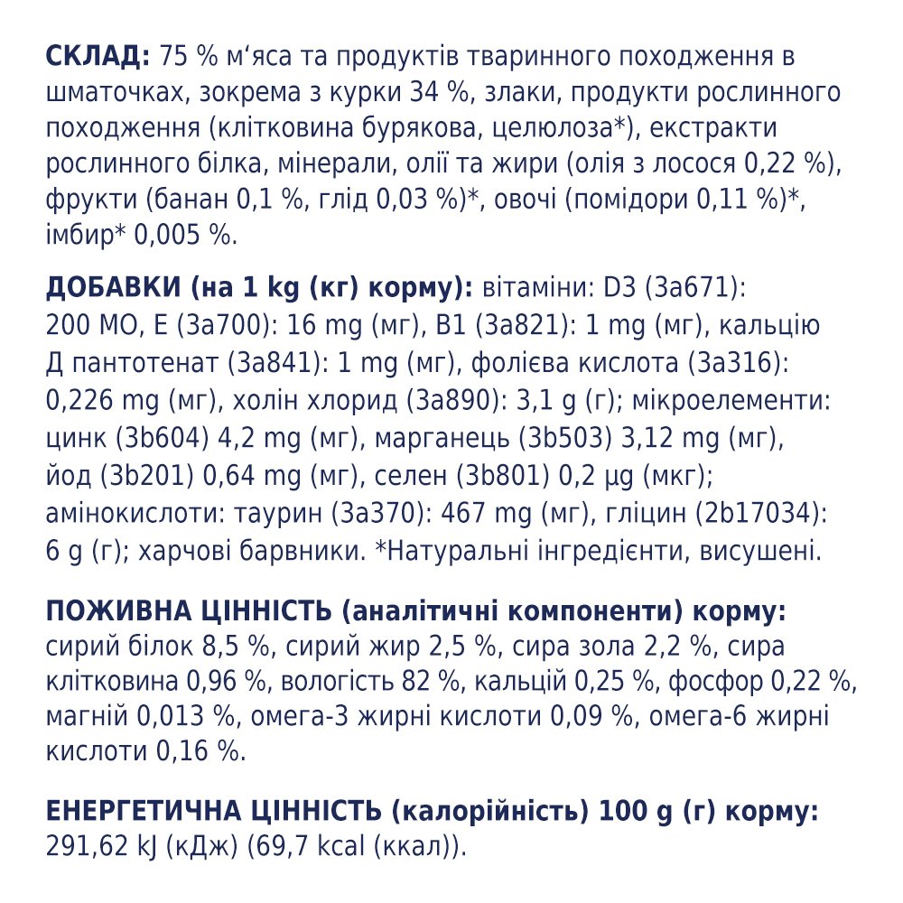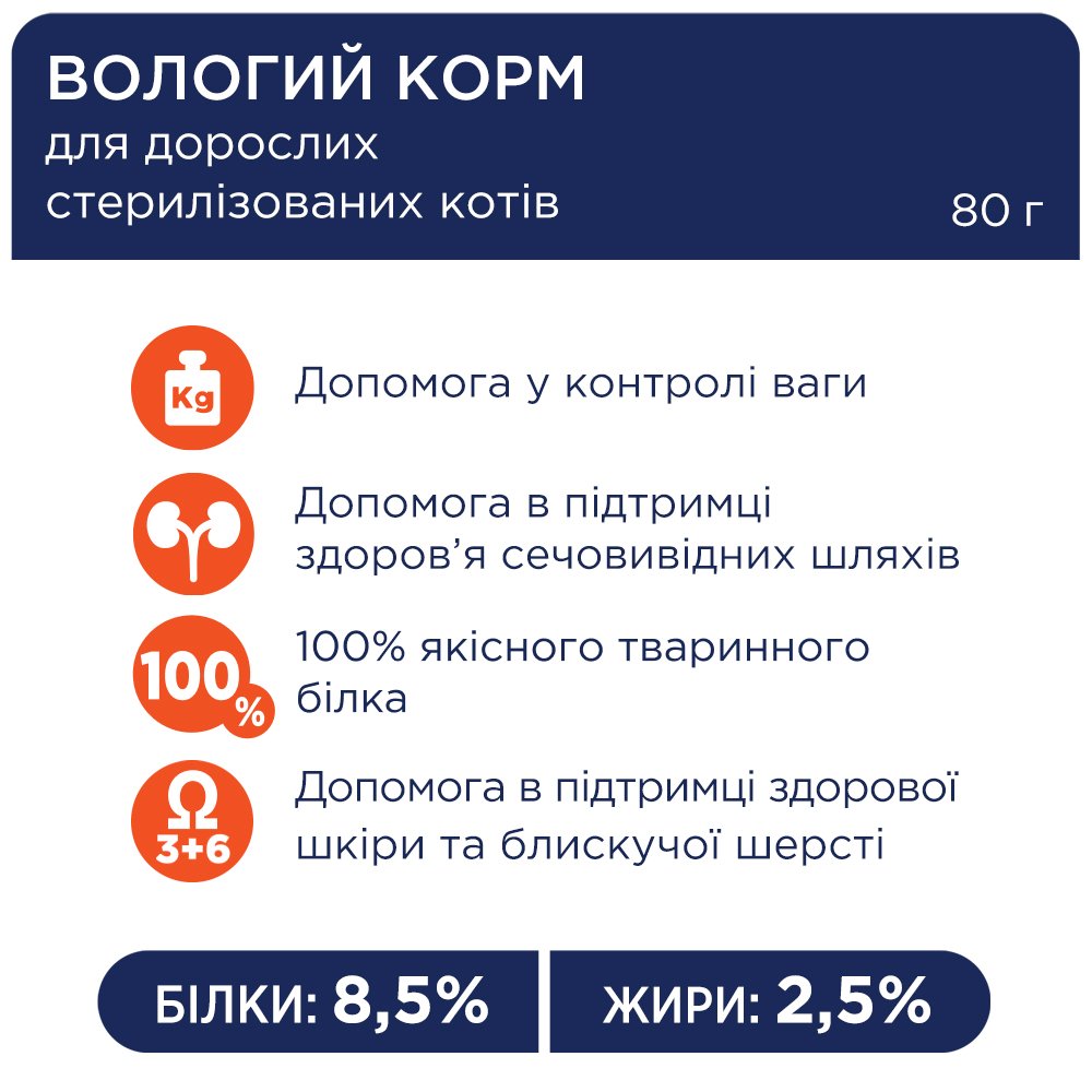 Це вологий пауч преміум-класу для стерилізованих котів з куркою, добре збалансований за білками й жирами, із зниженою калорійністю та поживними добавками для підтримки здоров’я дорослих котів.