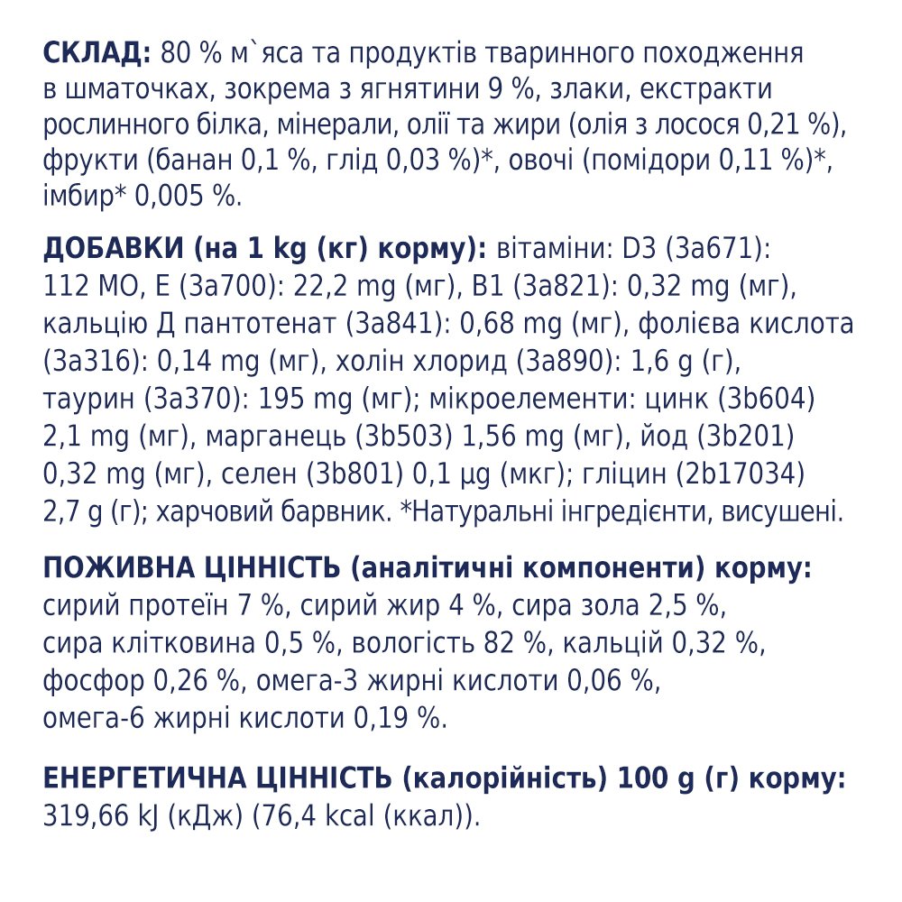 Вологий преміум-корм для малих порід собак з ягням у соусі. Легкозасвоюваний, підтримує м’язи та шерсть.