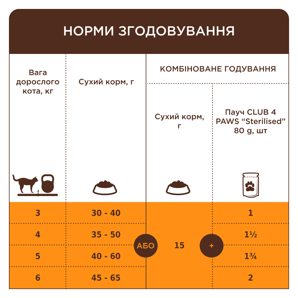 CLUB 4 PAWS — повнораціонний сухий корм преміумкласу, створений спеціально для дорослих стерилізованих котів та кастрованих котів. Збалансована формула з індичкою забезпечує улюбленця необхідними поживними речовинами, допомагає контролювати вагу та підтримує здоров’я сечовидільної системи після стерилізації.