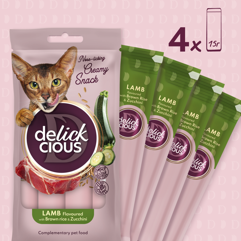 DELICKCIOUS™ кремові ласощі – ягня з додаванням коричневого рису та цукіні — додатковий вологий корм для котів у вигляді ніжних кремових порцій. Підходить як ласощі або доповнення до основного раціону, збагачений білком ягнятини та корисними овочами.