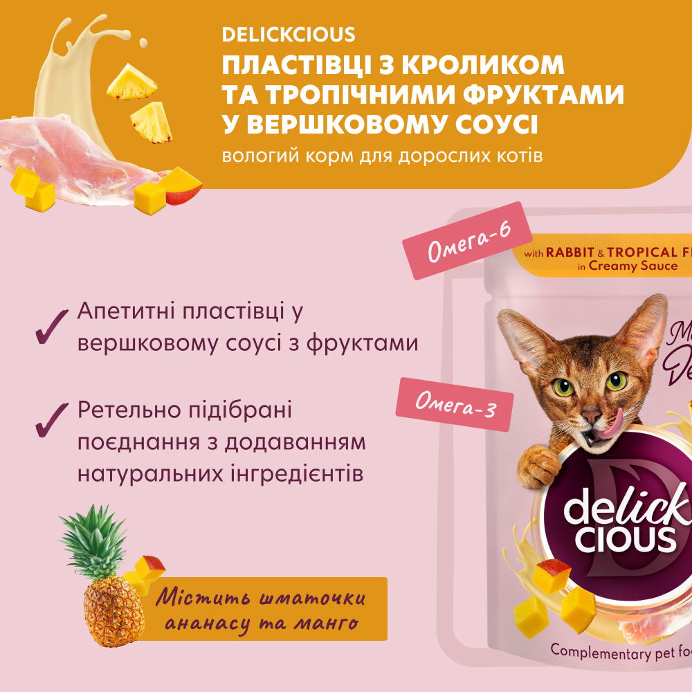 DELICKCIOUS™ «Пластівці з кроликом та тропічними фруктами у вершковому соусі» — додатковий вологий корм для дорослих котів з кроликом у ніжному вершковому соусі. Використовується як смачне доповнення до основного раціону.