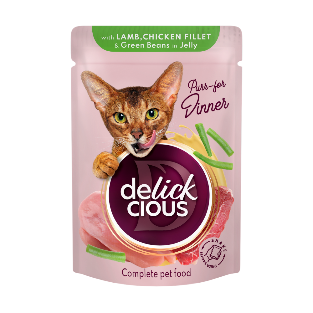 DELICKCIOUS™ «Шматочки з ягнятиною, курячим філе і спаржевою квасолею в желе» — повнораціонний вологий корм для дорослих котів із ягнятиною та куркою в апетитному желе. Підтримує здорове травлення, водний баланс та ідеально підходить для щоденного годування.