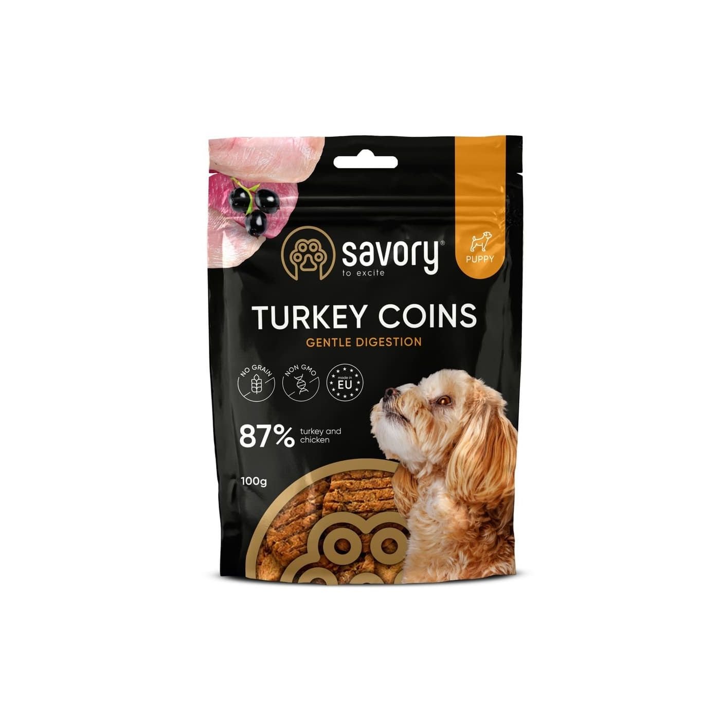 Лінійка ласощів Джерки від Savory – це нове поєднання улюблених смаків, високий вміст м’яса та щільні великі шматочки які можна смакувати ще довше. Монетки не містять зернових та інших додаткових вуглеводів, що робить їх абсолютно безпечними для улюбленців які мають чутливість до глютену. Додавання добірних ягід робить ці смаколики Savory не лише приємним але й корисним перекусом.