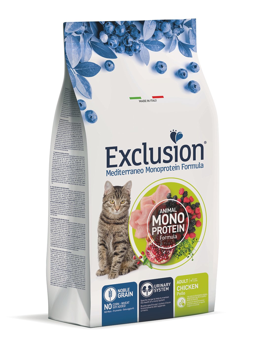 Exclusion Adult Chicken — повнораціонний сухий корм для дорослих кішок з куркою. Монопротеїнова формула з одним джерелом тваринного білка сприяє легкому травленню, підтримці здоров’я шкіри, шерсті та оптимальної фізичної форми кішки.