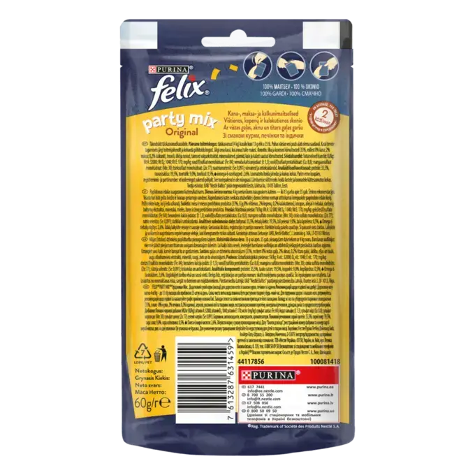 Ласощі Felix® Party Mix® – це додатковий сухий корм для котів, що стане смачним доповненням до щоденного раціону. Він допоможе господарям тішити улюбленця тоді, коли цього захочеться.