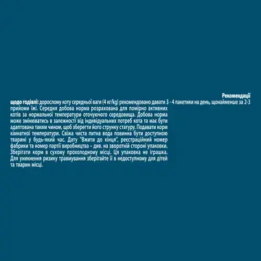 Дорослого кота середньої ваги (4 кг) годуйте від 3 до 4 пакетиків на день, за два або більше годування.