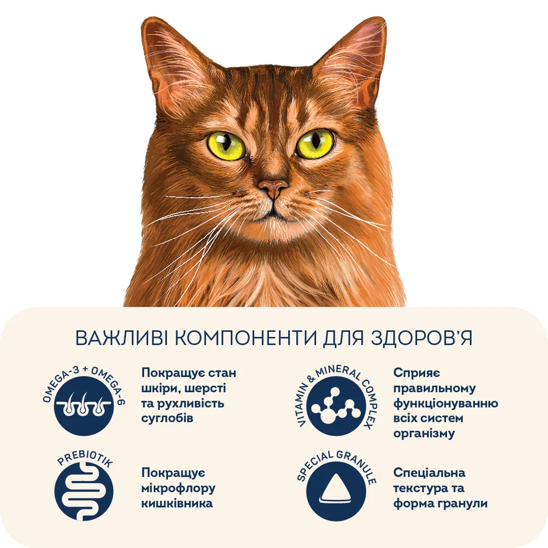 Корм забезпечує насичений блиск шерсті, тому ідеально підходить для котів з яскравим забарвленням та довгошерстим породам. Чудово підійде для котів з високою активністю.
