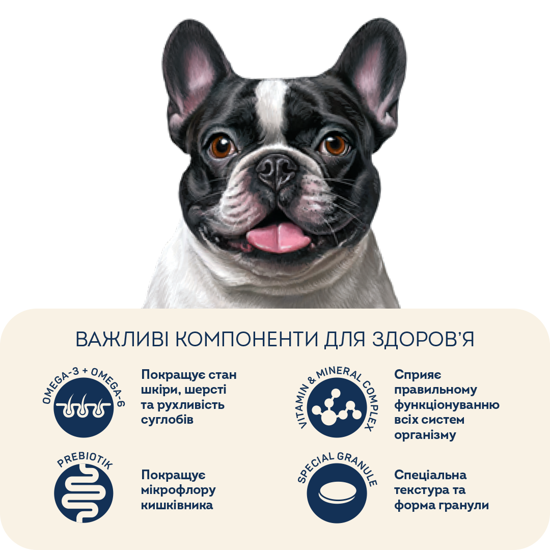 Чудовий вибір для собак малих і середніх порід. Форма та розмір гранули були розроблені спеціально для брахіцефалів, які мають особливості будови щелепного апарату (мопс, бульдог, пекінес, шарпей, японський хін, ши-тцу і т.д.). Підходить собакам зі слабкою системою травлення та схильністю до алергій.