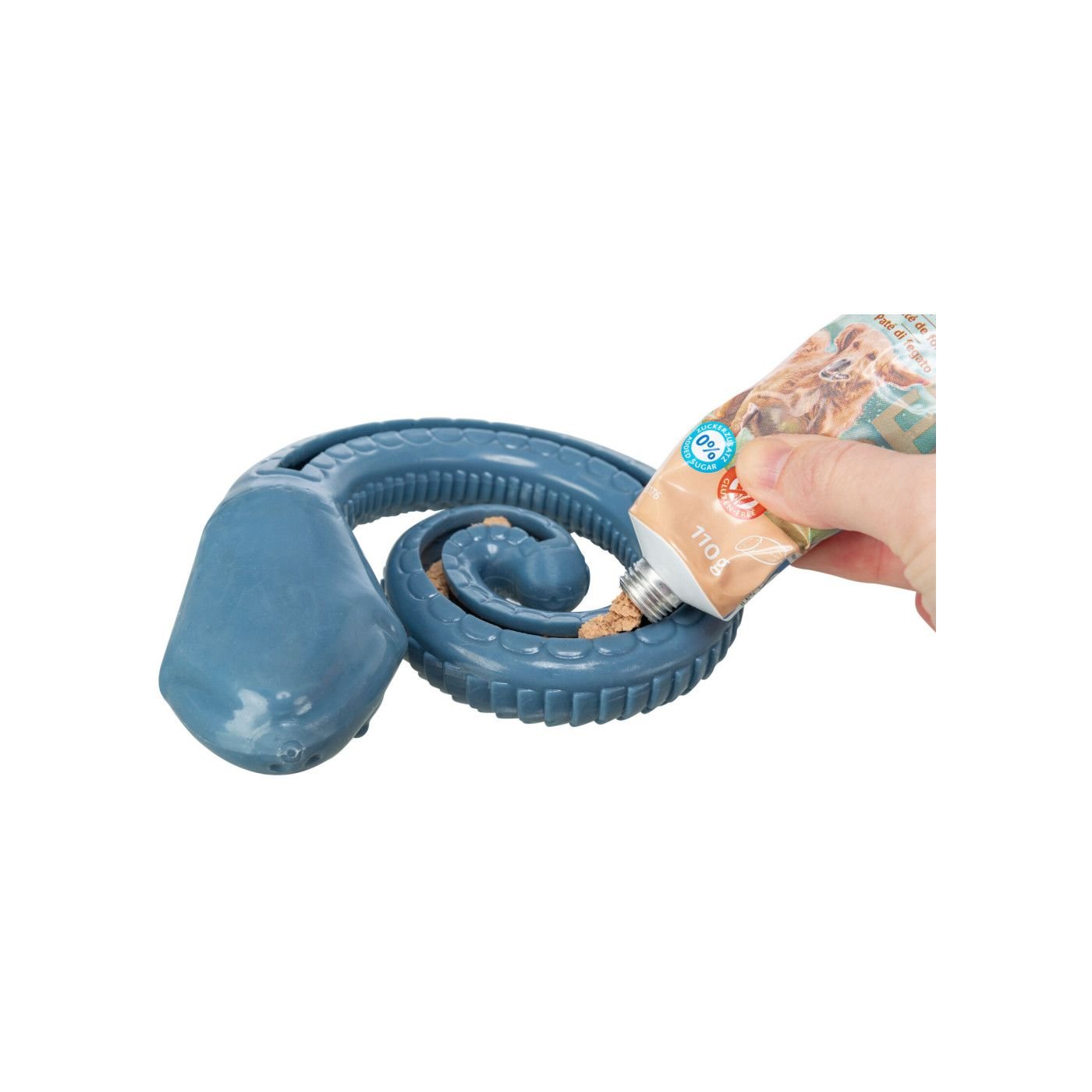 Внизу іграшки є отвір, який можна заповнити, наприклад, смачними паштетами або круглими ласощами. Незалежно від того, чи хочете ви дати своєму собаці нагороду чи просто привернути його увагу в ігровій формі, Snack Snake — це веселі зміни повсякденного життя.