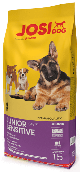 JOSERA JosiDog Junior Sensitive завдяки збалансованому співвідношенню кальцію та фосфору, підходить для чутливих собак з 8-го тижня життя. Рецептура, що не містить глютену, сприяє помірному зростанню та міцній структурі кісток.