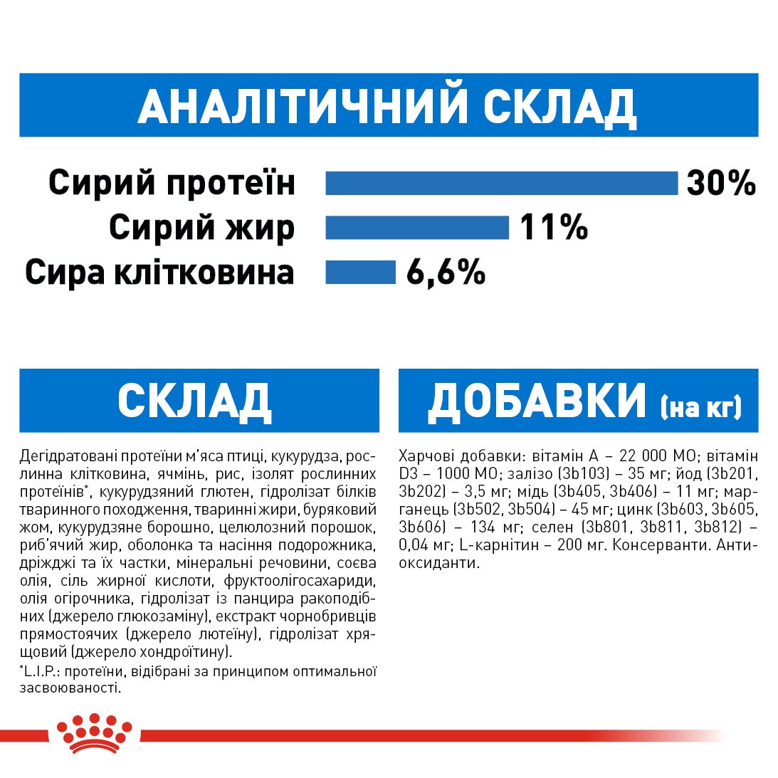 Склад: дегідратовані протеїни м’яса птиці, кукурудза, ячмінь, рис, ізолят рослинних протеїнів*, кукурудзяний глютен, гідролізат білків тваринного походження, рослинна клітковина, тваринні жири, буряковий жом, целюлозний порошок, мінеральні речовини, риб’ячий жир, дріжджі та їх частки, соєва олія, оболонка та насіння подорожника, фруктоолiгосахариди, олія огірочника, екстракт чорнобривців прямостоячих (джерело лютеїну).