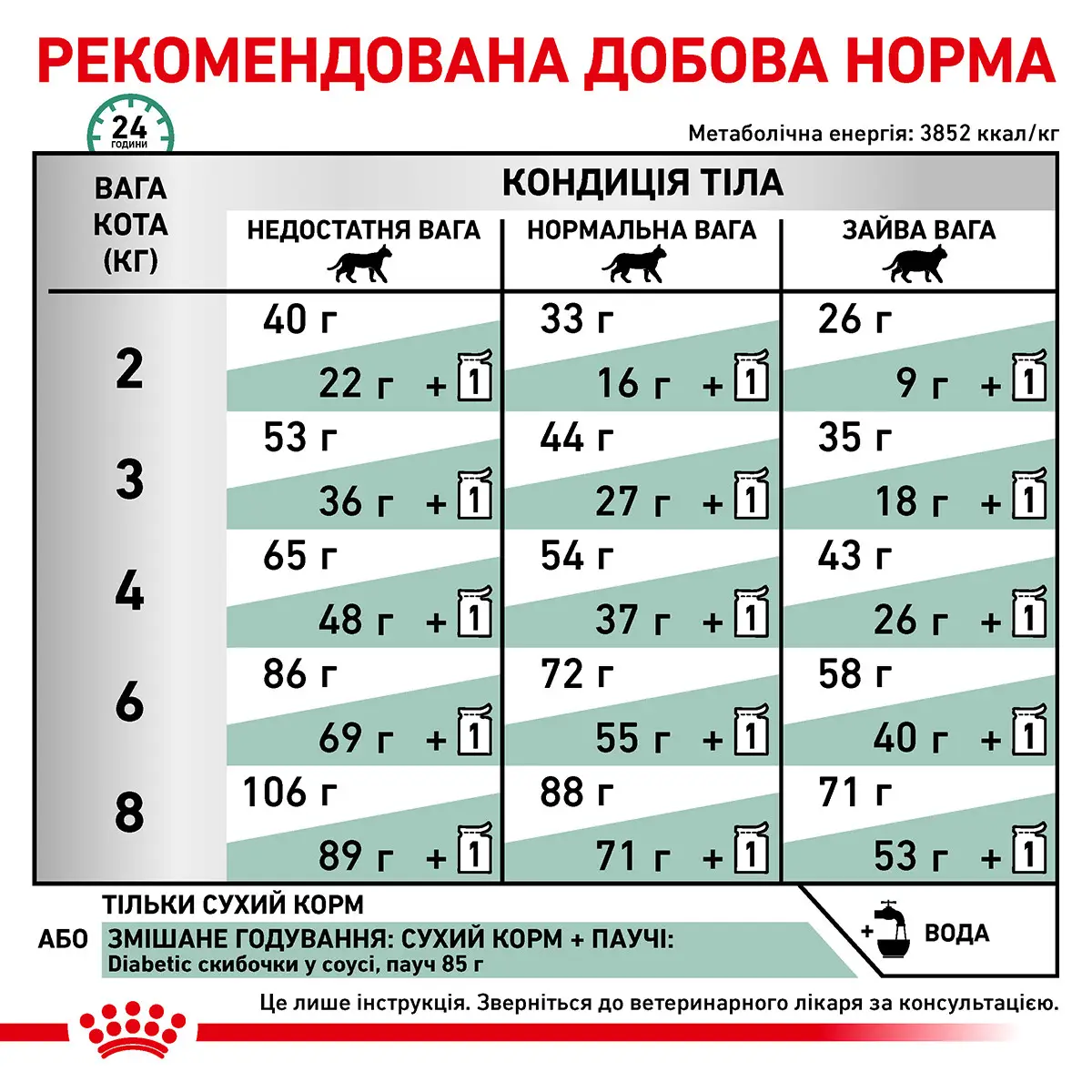 DIABETIC рекомендується застосовувати як ветеринарну дієту для пацієнтів з діагностованим цукровим діабетом, поки не буде досягнуто контролю клінічних ознак та гіперглікемії. Увага! При годуванні раціоном DIABETIC у котів значно підвищується чутливість до інсуліну. На початку застосування дієти рекомендується контролювати рівень глюкози в крові для корекції дози інсуліну. Після досягнення контролю глікемії дієту потрібно корегувати, в залежності від кондиції тіла тварини. Кондиція тіла 6 балів або менше: DIABETIC. Кондиція тіла 7-8-9 балів: перехід на SATIETY WEIGHT MANAGEMENT. Перед початком та/або продовженням використання дієти потрібна консультація ветеринарного лікаря. Початковий курс вживання сухого корму DIABETIC: 6 місяців. Пам’ятайте, що тварині слід забезпечити постійний доступ до питної води.