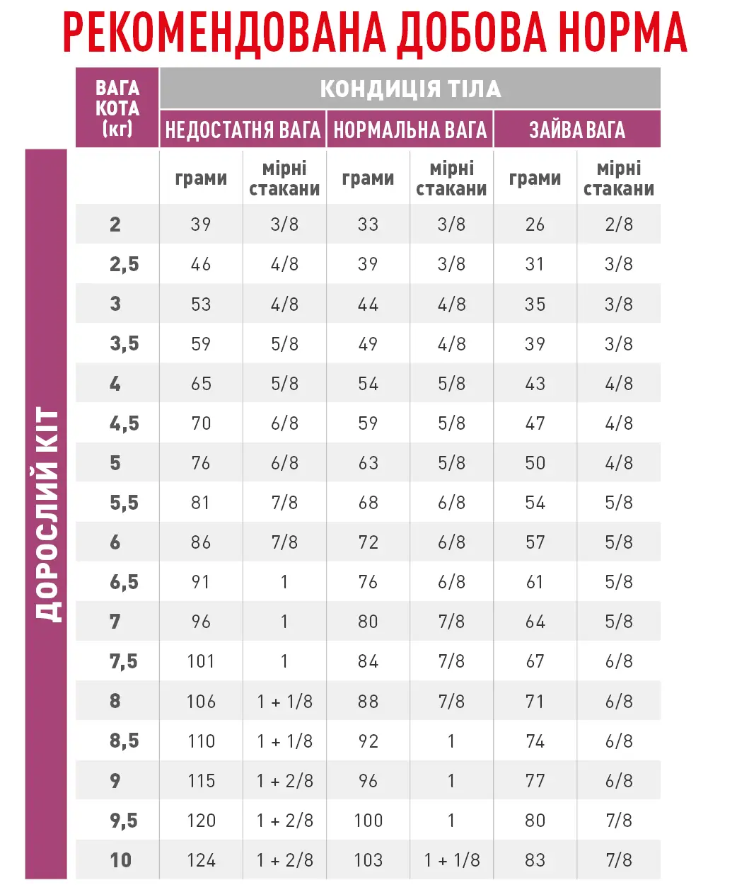 Рекомендації: отримуватись рекомендацій ветеринарного лікаря щодо харчування.