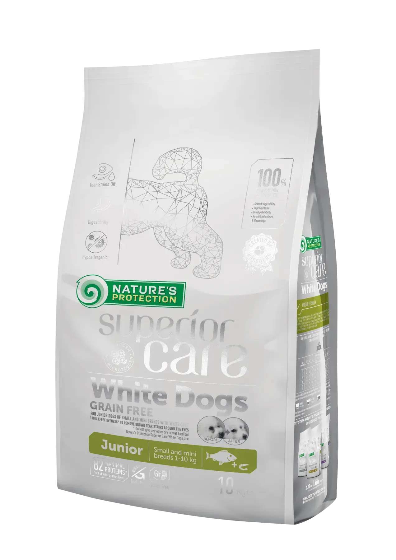 Nature’s Protection Superior Care White Dog – беззерновий сухий корм для собак молодших вікових груп (3-12 місяців), малих порід, білих і світлошерстих собак. Цей корм призначений для здорового росту цуценяти.