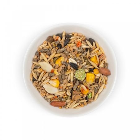 Склад: вівсяні пластівці, крупа горохова, ячмінь, насіння соняшнику, кукурудза, арахіс, яблуко сушене гранульоване, гречка, пшениця, насіння гарбуза, фруктово-зерновий гранулят, овочево-зерновий гранулят, злаково-трав’яний гранулят, трав’яний гранулят в асортименті, просо жовте, просо червоне, сушена морква, кероб подрібнений, горобина, овес, комбікорм.