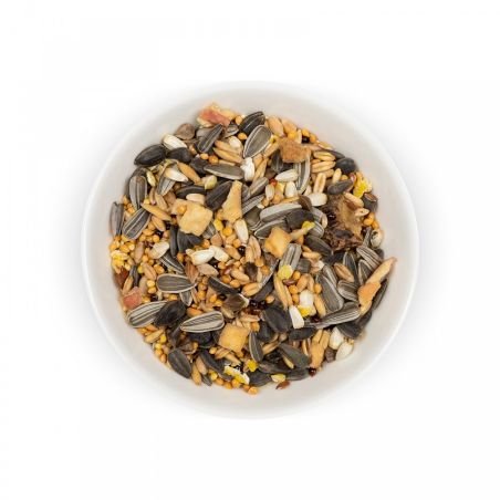 Склад: насіння льону, канаркове насіння, насіння конопель, пшениця, насіння соняшнику, кукурудзяні пластівці, арахіс, яблуко сушене гранульоване, гречка, сафлор, просо чорне, кероб подрібнений, насіння соняшнику сіре, горобина, виноград сушений, просо жовте, просо червоне, овес голозерний, сорго.