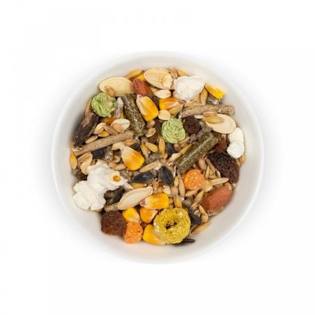 Склад: кукурудза, ячмінь, арахіс, вівсяні пластівці, виноград сушений, яблуко сушене гранульоване, насіння соняшнику, пшениця, насіння гарбуза, фруктово-зерновий гранулят, овочево-зерновий гранулят, злаково-трав’яний гранулят, трав’яний гранулят в асортименті, кероб подрібнений, попкорн, овес голозерний, комбікорм.