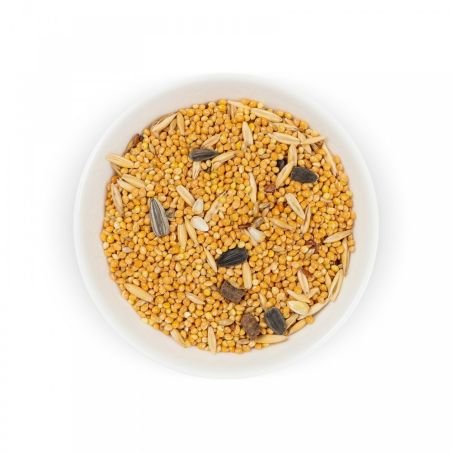 Склад: просо червоне, просо жовте, овес голозерний, канаркове насіння, просо чорне, насіння льону, насіння конопель, насіння соняшника, ріпак, яблука сушені гранульовані, сорго