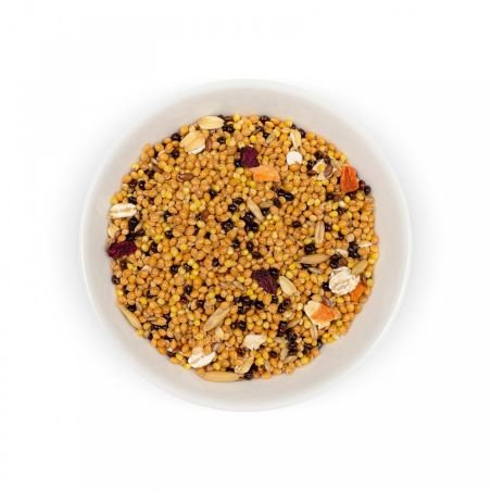 Суміш зернових культур відповідає раціону птаха у природних умовах. Додавання йоду забезпечує правильний обмін речовин та допомагає уникнути розладів, пов’язаних з утриманням у клітці. Каротиноїди сприяють активному синтезу пігментів, що надають птахам яскравого природного забарвлення.