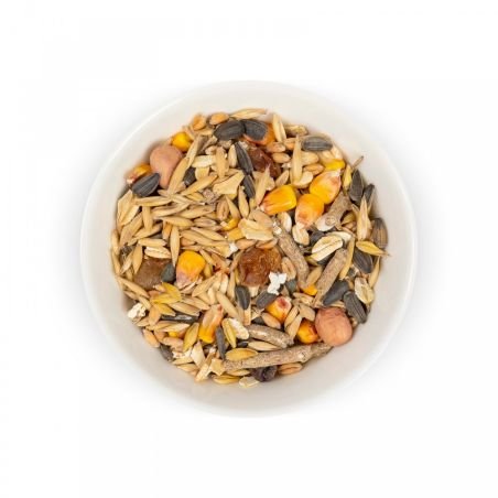 Склад: овес, кукурудза, комбікорм для шиншил, ячмінь, насіння соняшнику, вівсяні пластівці, арахіс, виноград сушений, яблука сушені гранульовані, пшениця.