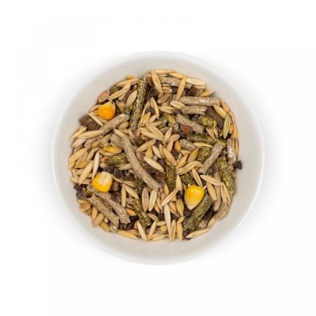 Склад: трав’яне борошно гранульоване в асортименті, овес, пшениця, комбікорм для шиншил, кукурудзяні пластівці, ячмінь, гречка, яблука сушені гранульовані, кукурудза.