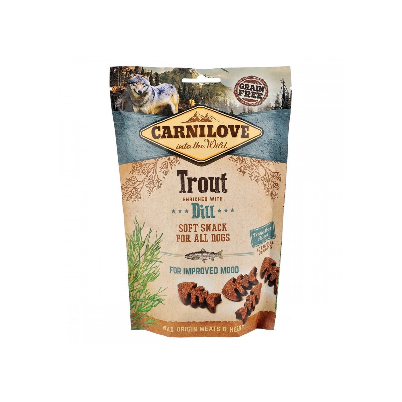 Carnilove Semi-Moist Trout enriched with Dill – напіввологі беззернові ласощі з фореллю і кропом для собак. Спокушають улюбленців своїм екзотичним смаком, а особливий склад снеків сприяє гарному настрою собак.