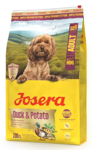 Josera Mini Duck & Potato міні-версія нашого популярного корму Ente&Kartoffel зі зменшеною крокетою для дорослих собак міні-порід. Беззернова рецептура з вишуканим качиним м’ясом забезпечує гарну шерсть і здорову шкіру завдяки біотину та цінним жирним кислотам. Містить помірний вміст енергії, саме тому ідеально підходить для собак із нормальним рівнем активності.