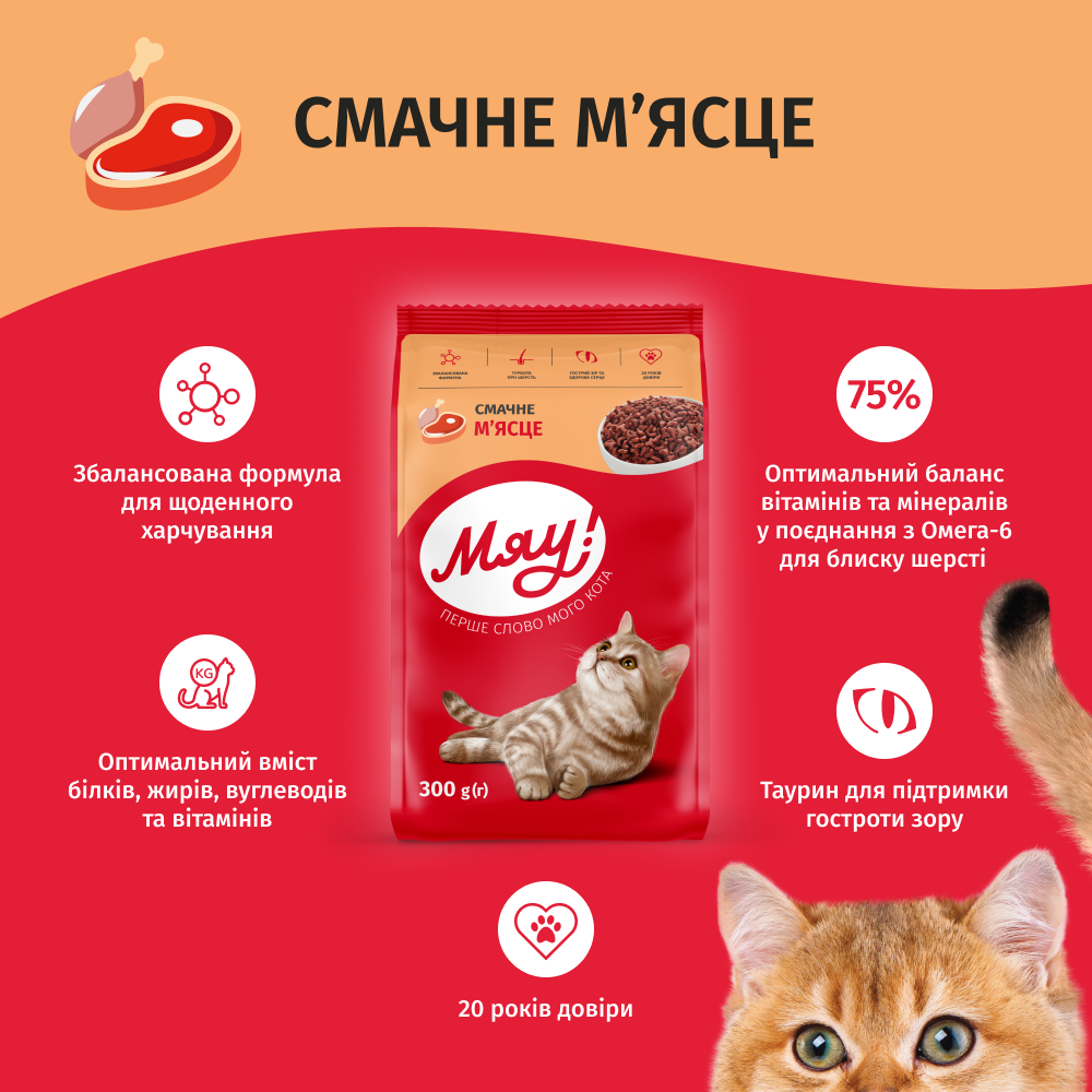 МЯУ — повнораціонний сухий корм для дорослих котів, розроблений для підтримки здорового способу життя. Основним джерелом білка є м’ясо, яке сприяє збереженню м’язової маси, розвитку та підтримці енергії кота.