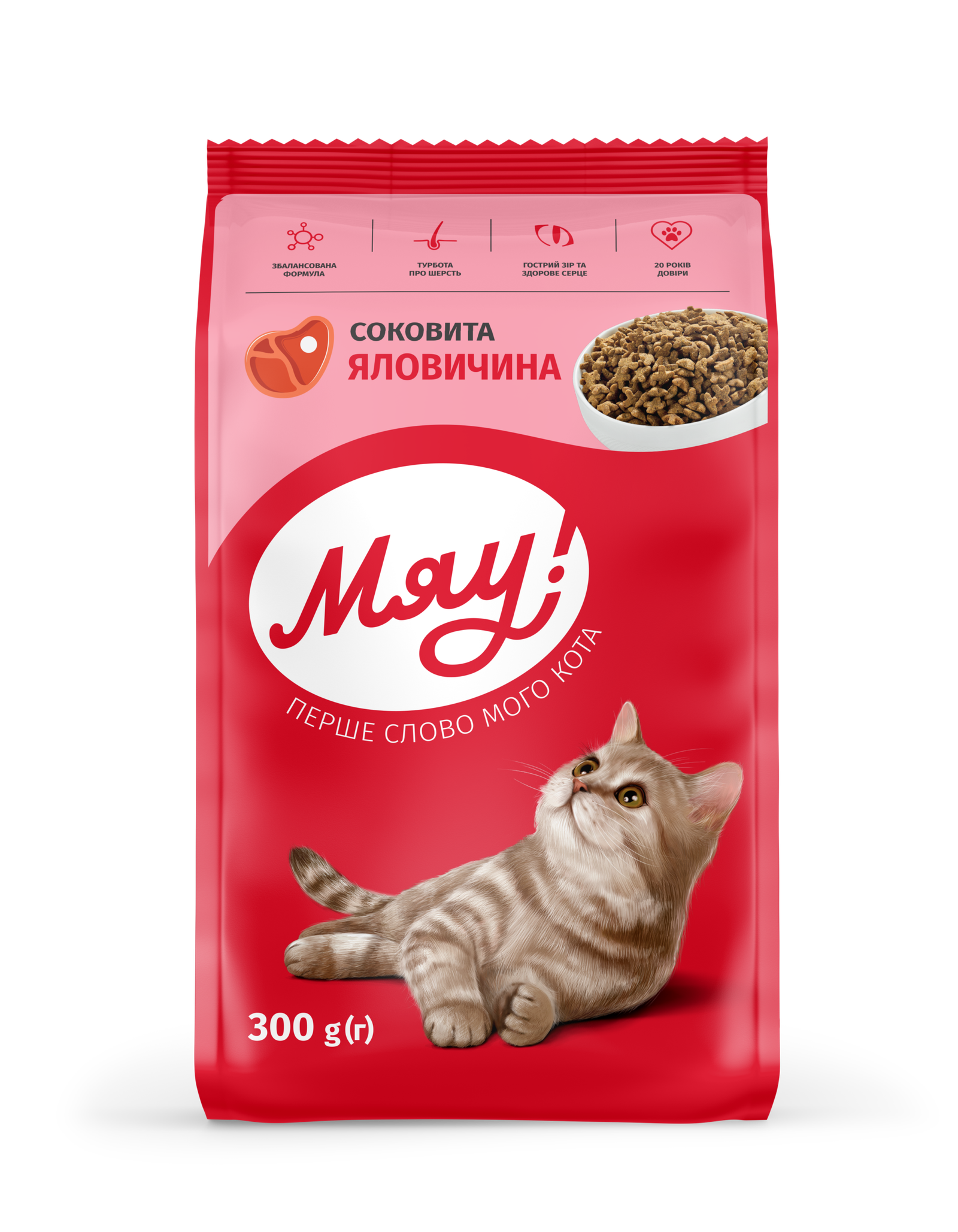 МЯУ — сухий корм з яловичиною для дорослих котів. Забезпечує збалансоване харчування, підтримує м’язову масу, здоров’я травлення та імунітет кота.