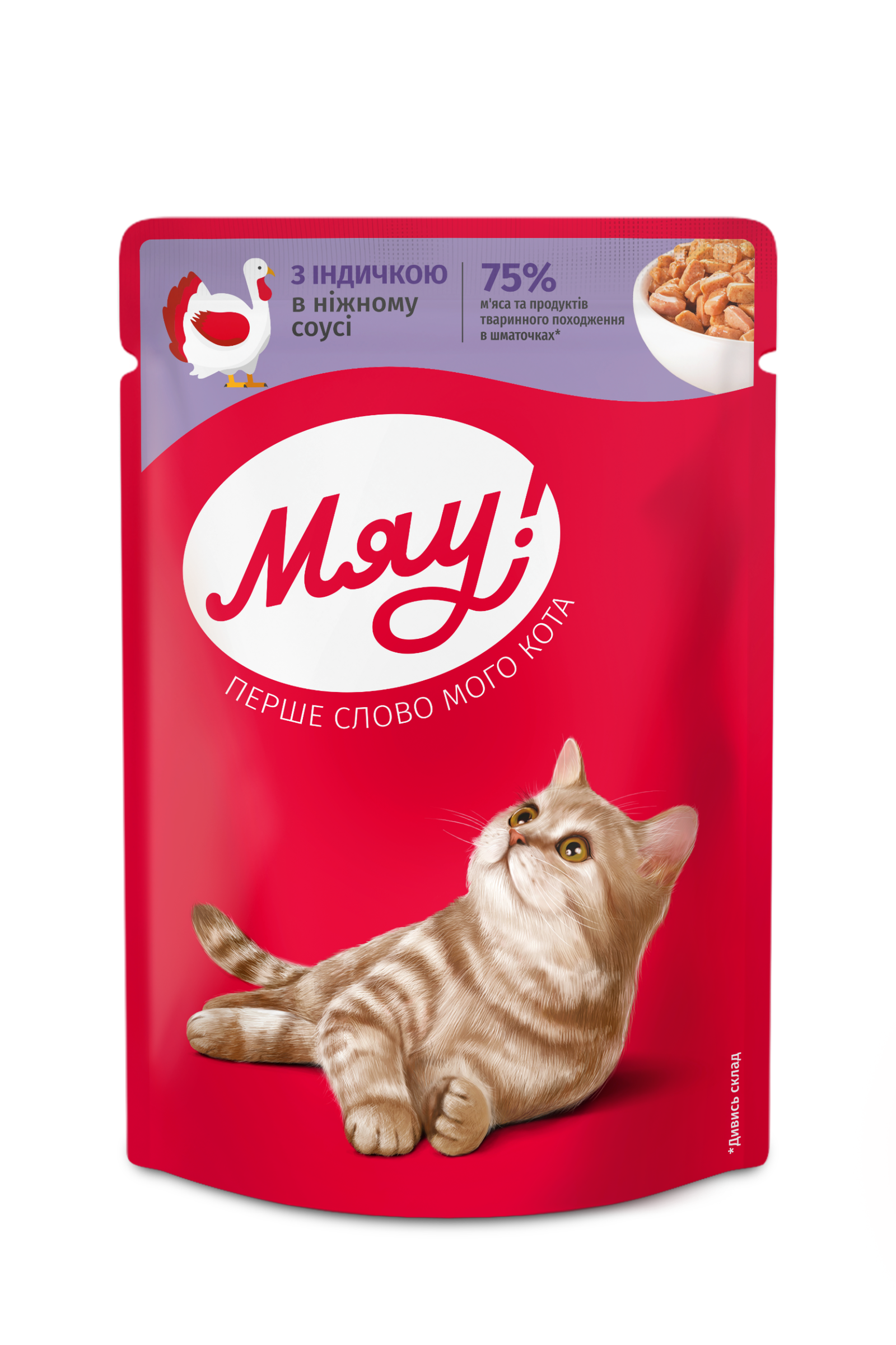 МЯУ — вологий корм для дорослих котів з індичкою в ніжному соусі. Забезпечує збалансоване щоденне харчування, підтримує м’язову масу, травлення та імунітет.