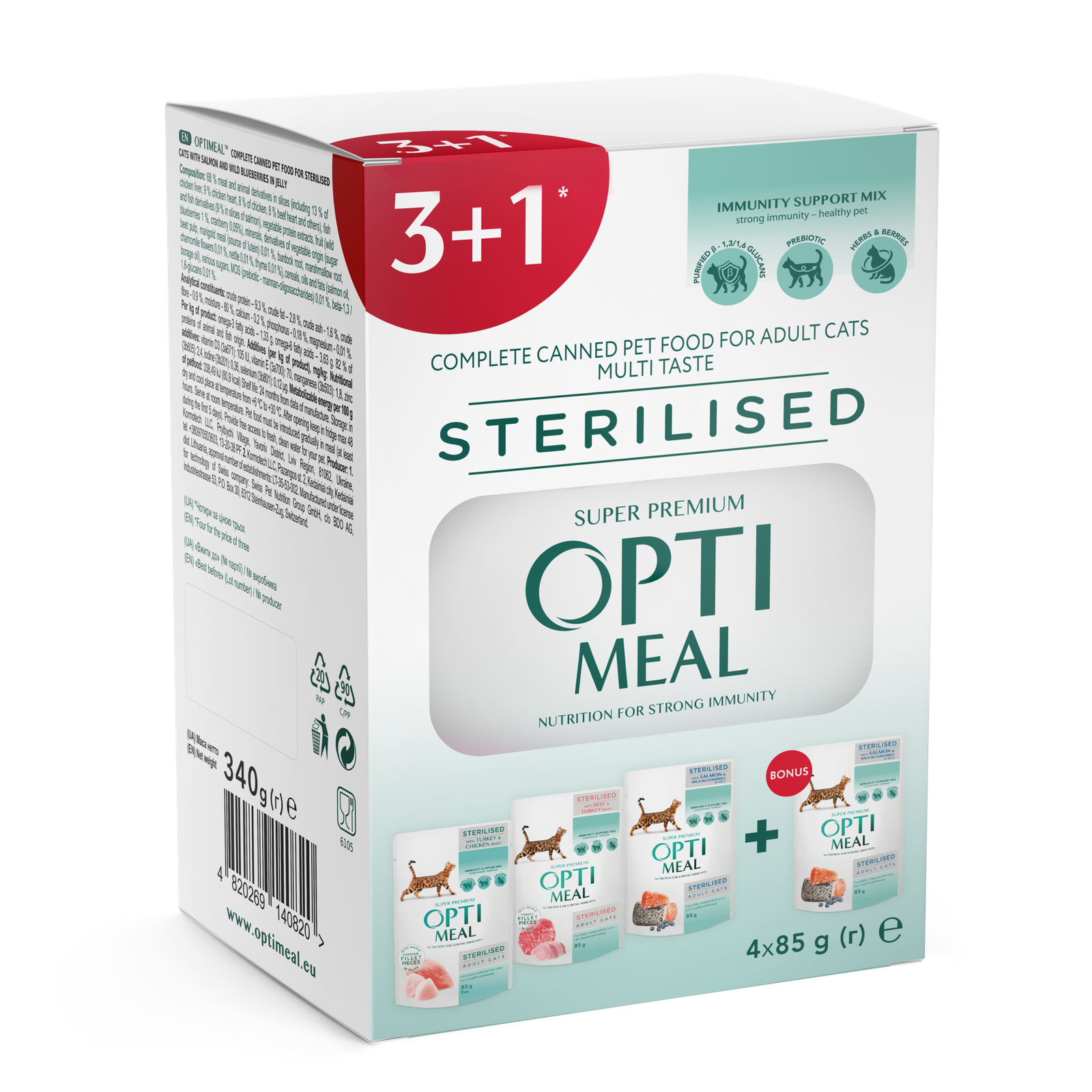 OPTIMEAL™ — повнораціонний консервований корм для стерилізованих кішок та кастрованих котів у форматі 3+1. Підтримує здорову вагу, сечостатеву систему та забезпечує збалансоване щоденне харчування.