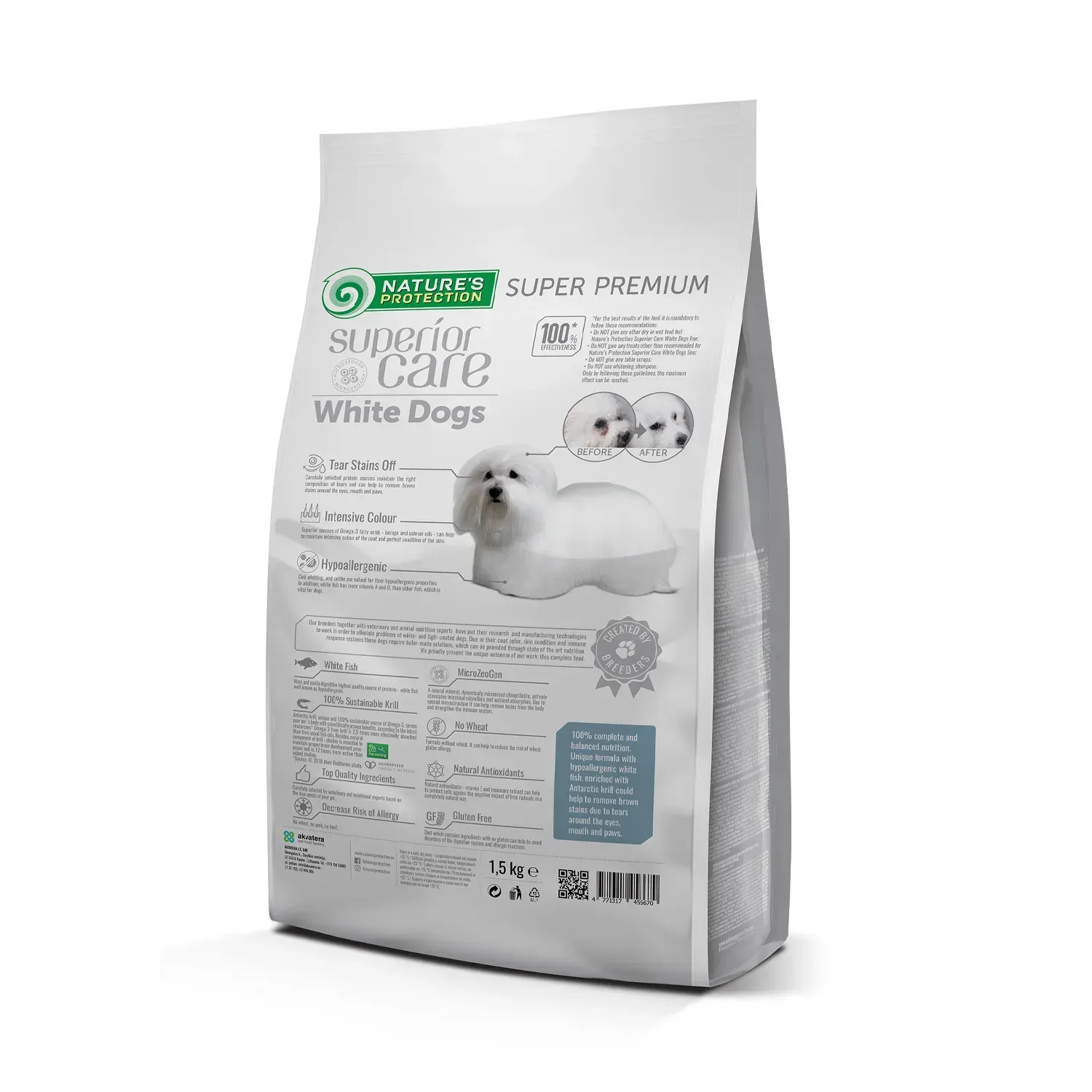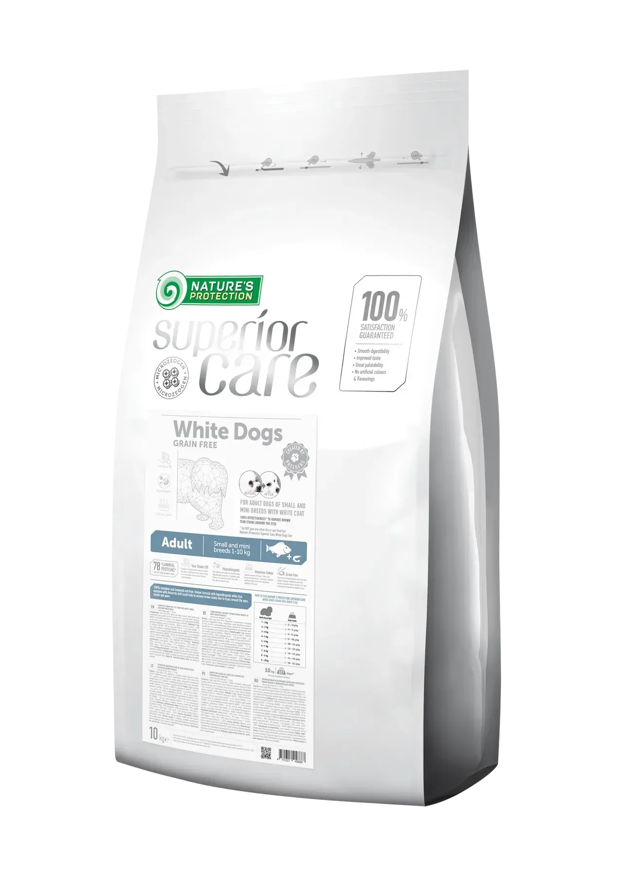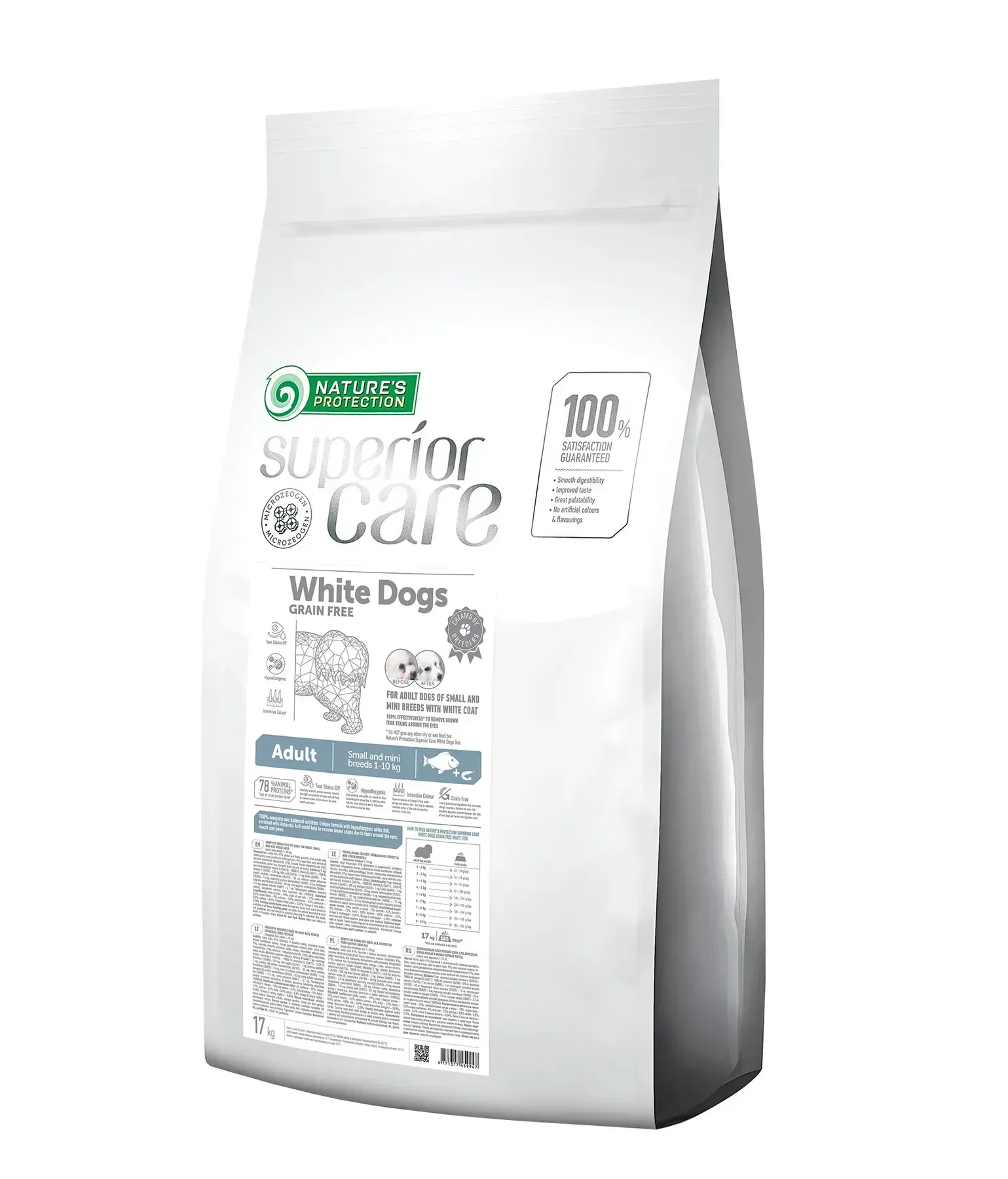 Nature’s Protection Superior Care White Dogs – беззерновий сухий корм супер-преміум класу для дорослих собак дрібних і дуже дрібних порід (1-10 кг) з білою та світлою шерстю (розмір гранули 6-8мм).
