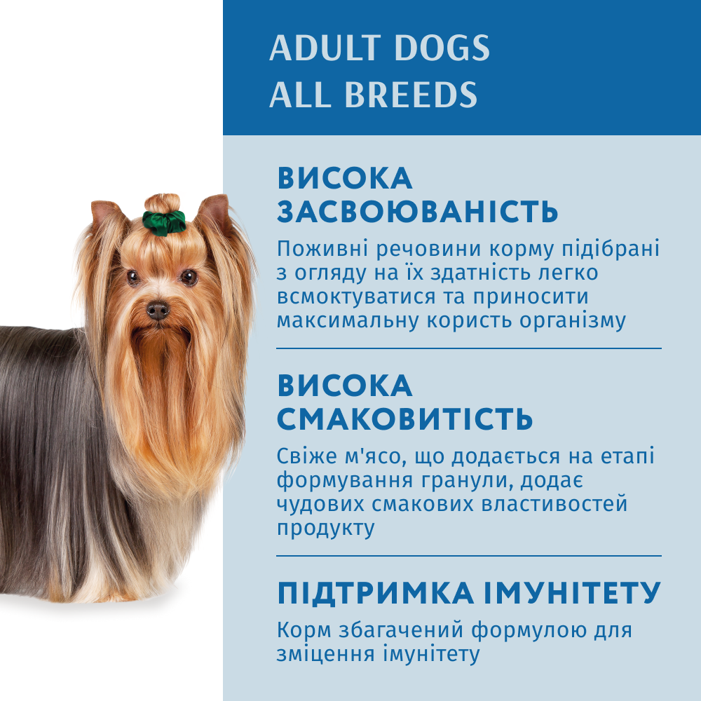 Корм не містить штучних барвників і консервантів та підходить для щоденного годування, забезпечуючи дорослих собак повноцінним, безпечним і смачним раціоном.