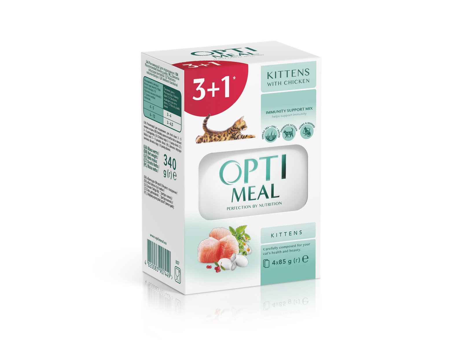 OPTIMEAL™ — повнораціонний консервований корм преміумкласу для кошенят, створений з урахуванням потреб організму, що активно розвивається. Курка є джерелом легкозасвоюваного тваринного білка, необхідного для правильного формування м’язової тканини та підтримки високого рівня енергії у кошенят.