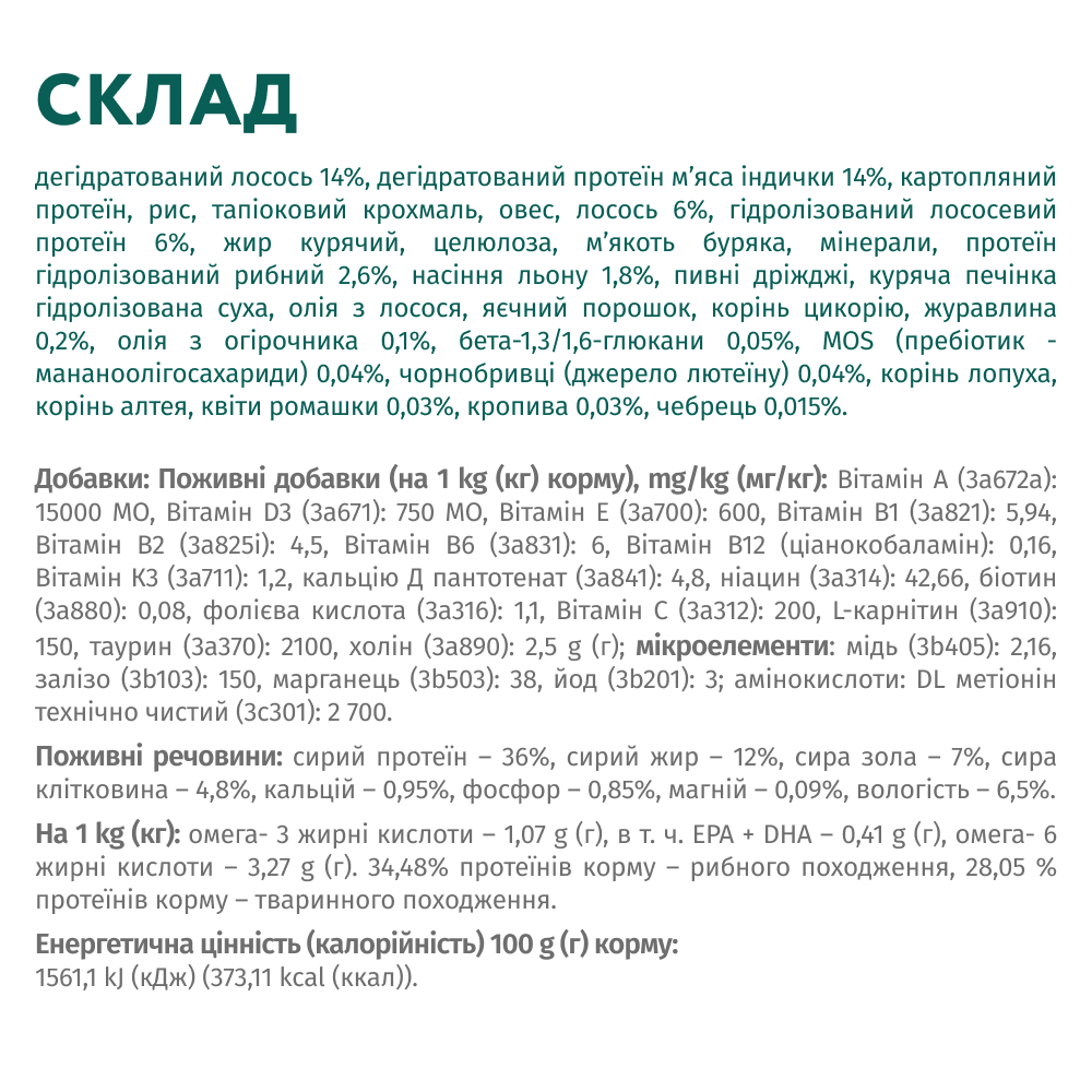 OPTIMEAL™ повнораціонний сухий корм для стерилізованих кішок та кастрованих котів з лососем розроблений з урахуванням змінених потреб тварин після стерилізації. Лосось є джерелом високоякісного білка та Омега-3 жирних кислот, які сприяють здоров’ю шкіри та блиску шерсті. Збалансований мінеральний склад допомагає підтримувати здоров’я сечовидільної системи, а помірна калорійність сприяє контролю ваги. Комплекс вітамінів і мінералів забезпечує загальне благополуччя та активність вашого улюбленця.