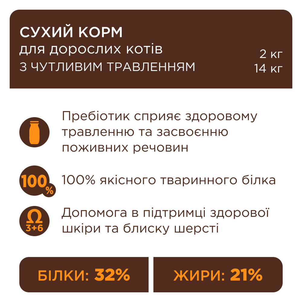 Легке засвоєння — високоякісні білки та оптимальний склад для котів із чутливим ШКТ.