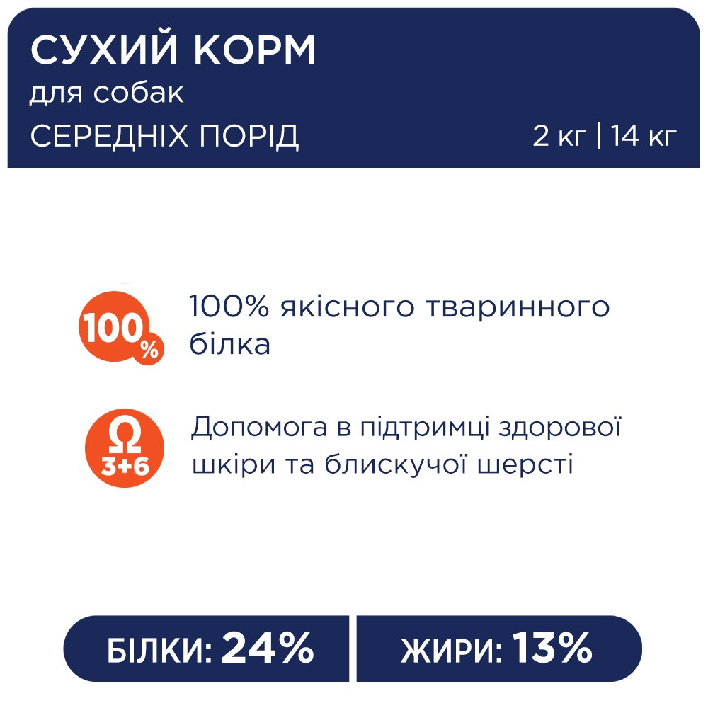 Преміум-сухий корм для середніх порід собак з куркою. Підтримує м’язи, шкіру та шерсть щодня.