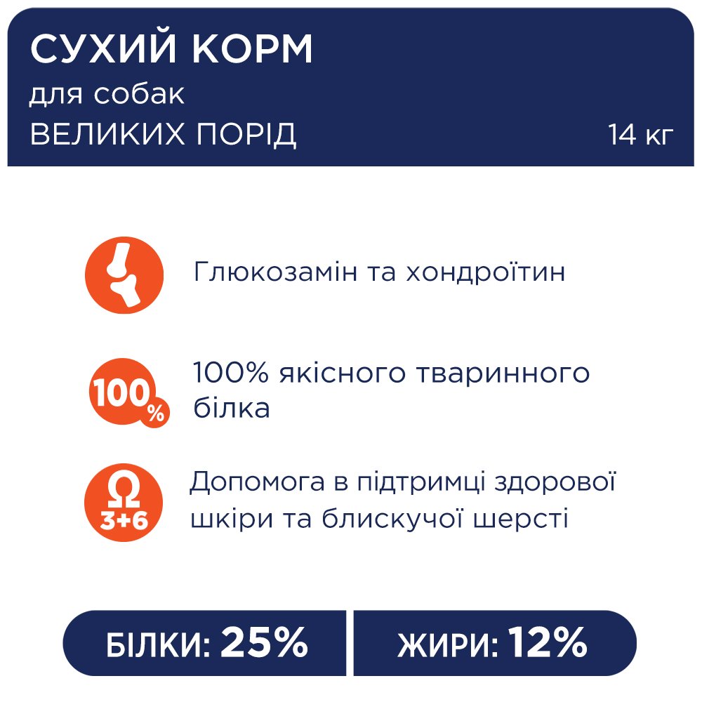 Преміум-сухий корм для великих порід собак. Підтримує м’язи, кістки та здорову шерсть щодня.