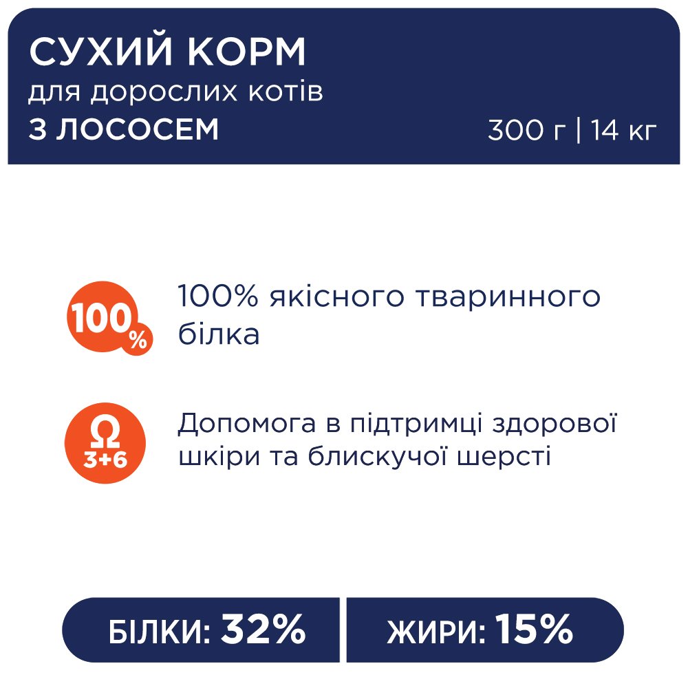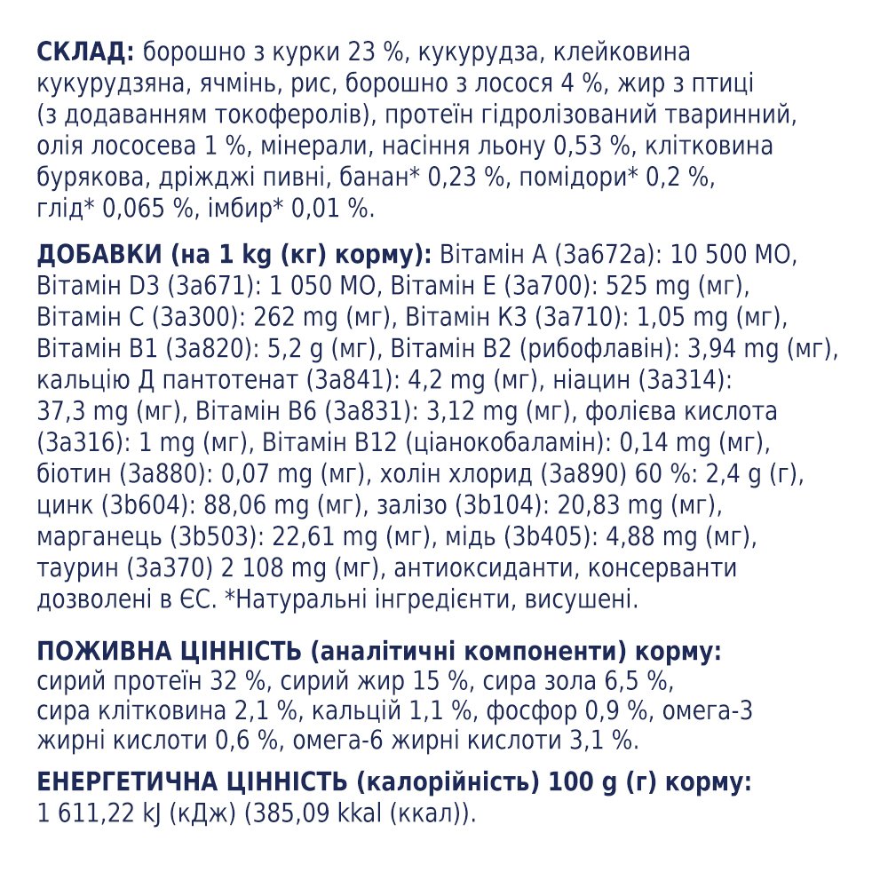 Сухий преміум-раціон містить 27% м’ясних та рибних інгредієнтів, у тому числі 23% з курки та 4% з лосося. Він збагачений, комплексом Омега 3 + Омега 6 для здорової шкіри та блискучої шерсті та формулою ІNTEGRAMIX для загальної підтримки здоров’я вашого улюбленця.