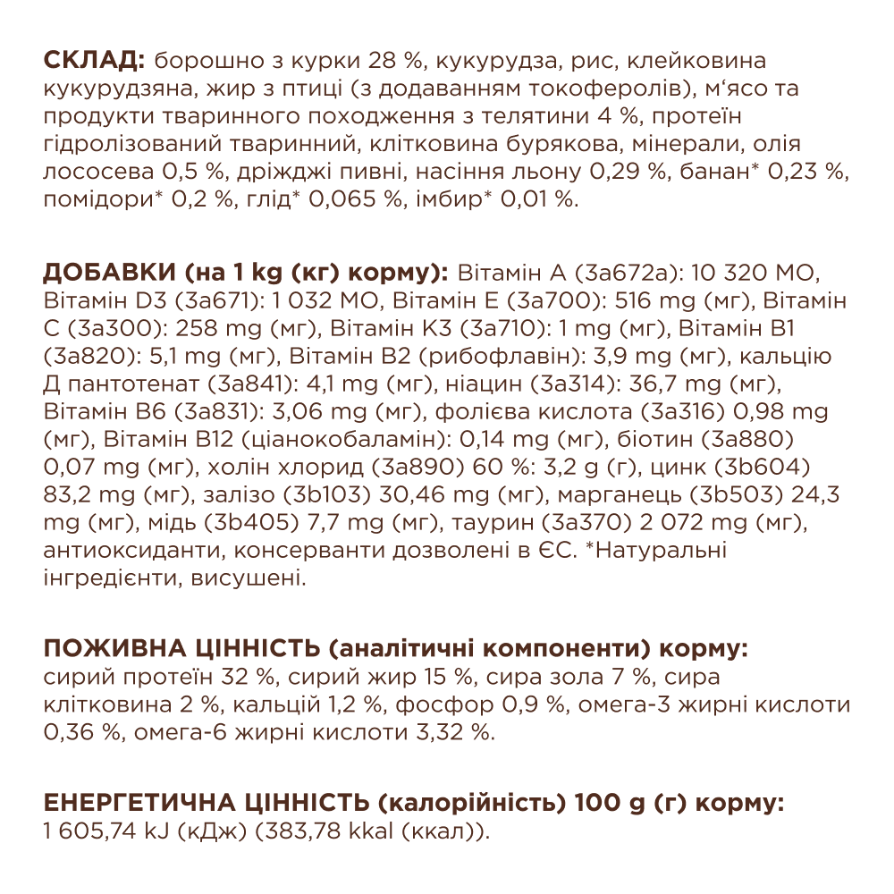 Сухий преміум-раціон містить 32% м’ясних інгредієнтів, а саме 4% з телятини та 28% борошна курки. Він збагачений, комплексом Омега 3 + Омега 6 для здорової шкіри та блискучої шерсті та формулою ІNTEGRAMIX для загальної підтримки здоров’я вашого улюбленця.