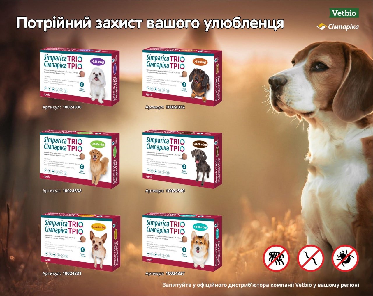 💡 Сімпаріка Тріо застосовується тваринам проти кліщів, бліх та гастроінтестинальних нематод, яких виявлено одночасно!
