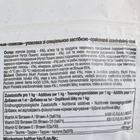 Склад: зернові (солод – 4%), м’ясо та та продукти тваринного походження (червоно-коричневі подушечки Нутрі Покетс: яловичина – 4%), олії та жири, екстракти рослинного білка, продукти рослинного походження (Нутрі Покетс зелені подушечки: котяча м’ята – 0,5%, подушечки Нутрі Покетс червоно-коричневі: лігноцелюлоза – 4%) риба та рибні продукти (подушечки Нутрі Покетс оранжево- коричневі: лосось – 4%), мінерали, дріжджі, молоко та молочні продукти.