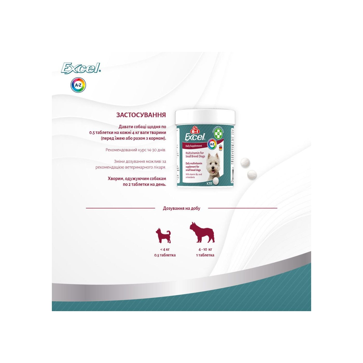 Застосування: давати собаці щодня по 0.5 таблетки на кожні 4 кг ваги тварини (перед їжею або разом з кормом).