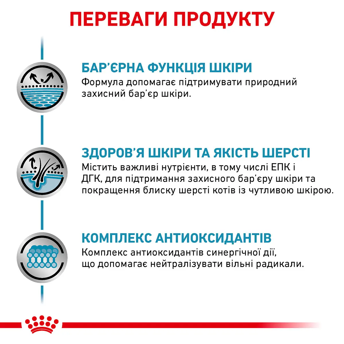 Містить важливі нутрієнти, в тому числі ЕПК і ДГК, для підтримання захисного бар’єру шкіри та покращення блиску шерсті котів із чутливою шкірою.