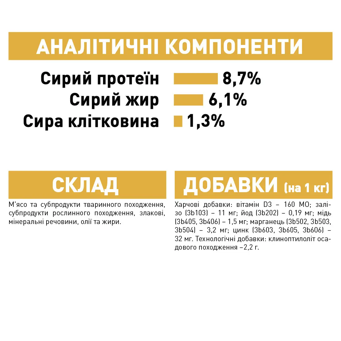 харчові добавки: вітамін D3 – 160 MO; залiзо (3b103) – 11 мг; йод (3b202) – 0,19 мг; мiдь (3b405, 3b406) – 1,5 мг; марганець (3b502, 3b503, 3b504) – 3,2 мг; цинк (3b603, 3b605, 3b606) – 32 мг. Технологічні добавки: клиноптилоліт осадового походження – 2,2 г.